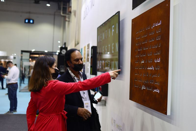 The QLOCKTWO’s vibrant stall and attractive designs attracts visitors attention at INDEX.Image Credit: Clint Egbert/Gulf News